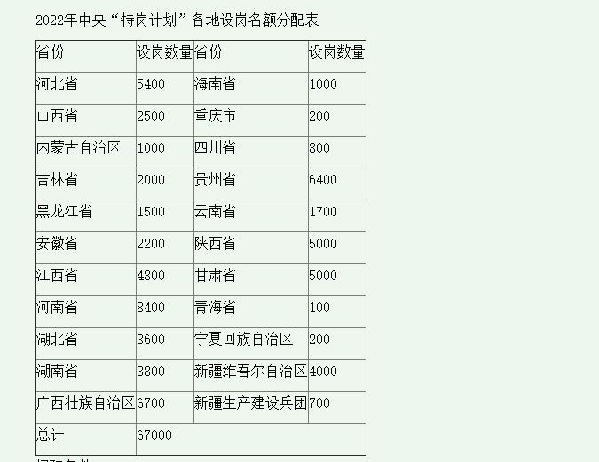 2022年計劃招聘中央“特崗計劃”教師名額發(fā)布了。2022年全國招聘“特崗計劃”教師67000名,共有22個?。ㄊ小⒆灾螀^(qū))參加今年的特崗教師招聘,其中特崗教師招聘人數(shù)最少地區(qū)是青海省,特崗招聘100人,特崗教師招聘人數(shù)最多的地區(qū)是河南省,特崗招聘8400人,貴州省特崗教師招聘6400人。